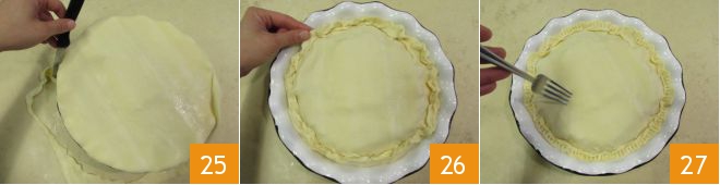 Corte o excesso da borda 25 e dobre toda a massa sobre a borda 26. Pressione levemente os dentes de um garfo na borda e depois fure a massa na superfície 27 para não inflar durante o cozimento.