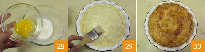Em uma tigelinha, misture o creme de leite com a gema 28 e com essa mistura pincele a superfície da torta 29. Asse em forno estático pré-aquecido a 180°C por 60 minutos. Quando estiver pronto, retire do forno e deixe esfriar um pouco antes de servir 30.