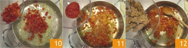 Adicione os pimentões 10 e cozinhe em fogo moderado por mais 10 minutos; os vegetais devem perder cerca de 50% do seu volume. Adicione o purê de tomate 11, depois continue refogando por alguns minutos para secar bem a mistura. Neste ponto, adicione o atum escorrido 12 e mexa, desmanchando-o com a colher.