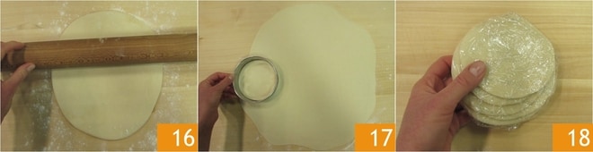 Retome a massa e estenda até a espessura de 1,5 mm; você pode usar um rolo de massa ou a máquina de massa 16. Corte 18 discos com um cortador de massa de 12 cm de diâmetro 17. Se não os usar imediatamente, pode embrulhá-los em filme plástico e guardá-los na geladeira 18.
