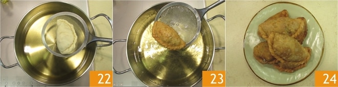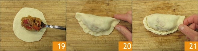 Coloque um disco de massa na superfície de trabalho e adicione uma colherada de recheio no centro 19. Dobre o disco ao meio e pressione as bordas com os dedos para selá-las 20, depois faça pequenas dobras para criar o típico cordão 21. Como alternativa, você pode selar a borda pressionando com os dentes de um garfo.