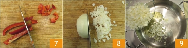 Enquanto isso, prepare o recheio: limpe e corte os pimentões 7 e as cebolas 8 em cubos, depois escorra o atum. Em uma frigideira, derreta a banha no óleo e frite a cebola por alguns minutos 9.