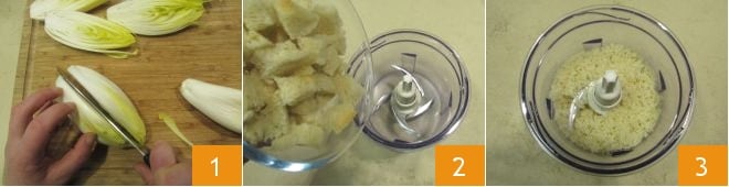 Para preparar a endívia belga gratinada, primeiro pré-aqueça o forno a 200° em modo estático, depois lave os maços de endívia belga em água corrente e corte-os ao meio longitudinalmente com uma faca 1. Reserve a endívia e passe para a preparação da camada: corte o pão amanhecido em cubos, depois coloque-os em um processador 2 e triture até que fique uniformemente esfarelado 3.
