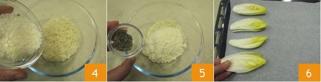 Transfira o pão triturado para uma tigela, adicione o queijo parmesão ralado 4 e o orégano 5, depois tempere com sal e pimenta e misture bem tudo. Agora pegue uma assadeira forrada com papel manteiga e coloque a endívia belga que você havia cortado anteriormente com o lado externo voltado para baixo 6.