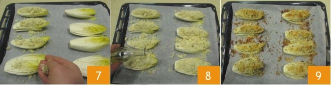 Distribua a camada sobre a endívia belga, tentando cobri-la completamente 7, depois adicione um fio de azeite 8 e asse em forno estático a 200° por cerca de 15 minutos, até que a camada esteja bem dourada 9. Sua endívia belga gratinada está pronta para ser servida!