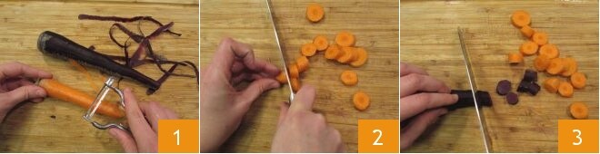 Para preparar o ensopado de beterrabas e lentilhas, primeiro prepare todos os ingredientes: lave e descasque as cenouras laranja e roxa 1, depois corte ambas em rodelas de cerca de 1 cm de espessura (2-3).