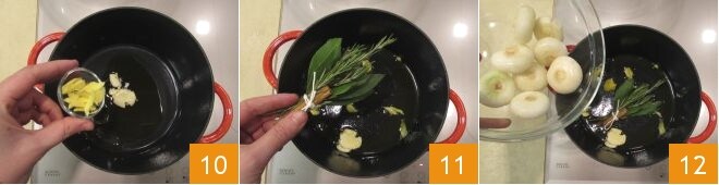 Agora pegue uma panela de ferro fundido com tampa hermética, especialmente adequada para cozimentos lentos, aqueça o óleo e adicione o alho esmagado e o gengibre 10. Deixe fritar por alguns minutos em fogo alto, depois adicione o maço de ervas 11 e, logo depois, adicione também as cebolinhas 12,