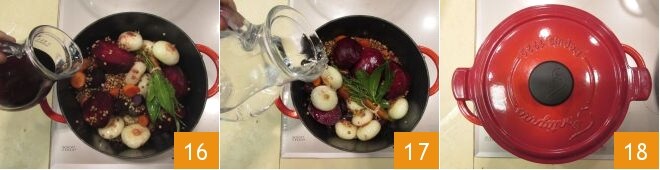 Deixe tudo tostar por alguns minutos, mexendo frequentemente com uma colher de pau, depois adicione o vinho tinto 16 e deixe evaporar. Neste ponto, abaixe o fogo e cubra com água até cobrir os ingredientes (a quantidade de água dependerá do tamanho da panela, usamos 500 g para uma panela de 20 cm de diâmetro) 17. Cubra com a tampa 18 e deixe cozinhar em fogo baixo por 2 horas, mexendo de vez em quando e adicionando um pouco mais de água se necessário: neste caso, adicionamos mais 200 g de água em algumas vezes. Durante os últimos 20 minutos, ajuste o sal e a pimenta. Se ao final da cocção o ensopado estiver muito líquido, deixe reduzir por mais alguns minutos sem a tampa; se, ao contrário, estiver muito seco, pode adicionar mais uma concha de água.