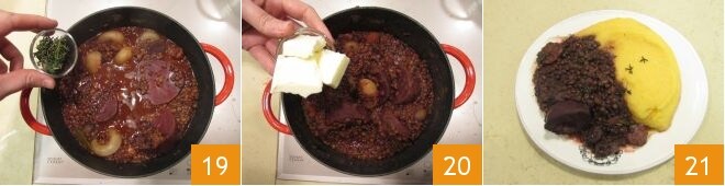 Após as 2 horas, remova o maço de ervas e verifique o cozimento das beterrabas com um garfo: os dentes devem penetrar facilmente, mas a consistência deve ser ainda firme e carnosa. Neste ponto, desligue o fogo e adicione o tomilho fresco 19, depois acrescente a manteiga 20, cubra com a tampa e deixe derreter suavemente. Por último, misture bem e sirva seu ensopado perfumado de beterrabas e lentilhas com polenta ou purê 21!