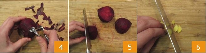 Descasque também as beterrabas 4 e divida-as ao meio 5, depois descasque uma raiz pequena de gengibre fresco e corte-a em fatias finas 6.