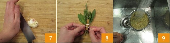 Esmague o dente de alho com as costas de uma faca 7 e retire a casca. Amarrem com um barbante os raminhos com as folhas de louro, o ramo de alecrim e o pau de canela 8. Por fim, enxágue as lentilhas em água corrente 9 e faça o mesmo com as cebolinhas.