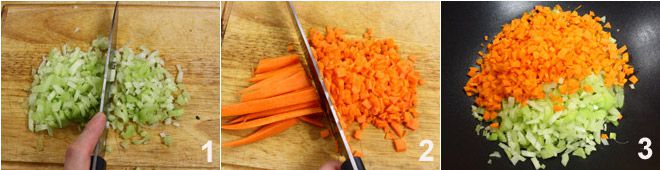 Para preparar o ensopado de carne com cebolas, comece picando o aipo 1 e as cenouras 2, que servirão como base para o refogado. Aqueça uma panela ampla com duas colheres de sopa de óleo, adicione o aipo e as cenouras picadas 3 e cozinhe o refogado.