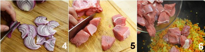 Corte também as cebolas em fatias finas 4 e reserve. Enquanto isso, prepare a carne: corte a vitela em pedaços 5 e, quando o refogado estiver pronto, adicione os pedaços de carne 6 e doure-os.