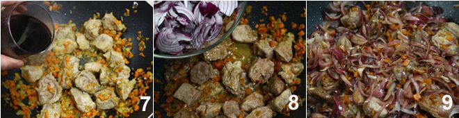 Despeje o vinho tinto 7 e adicione as fatias de cebolas 8. Continue o cozimento em fogo baixo 9, adicionando aos poucos o caldo de carne,