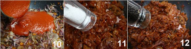 por fim, incorpore o molho de tomate 10. O cozimento do ensopado levará cerca de 1 hora. Uma vez que o molho for absorvido pela carne, ajuste o sal 11 e a pimenta 12. O ensopado de carne com cebolas estará pronto quando a carne estiver macia e as cebolas bem cozidas.