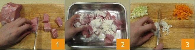Para preparar o ensopado de porco, comece cortando a lombo em cubos de cerca de dois centímetros 1, depois enfarinhe-os de todos os lados 2 e reserve. Enquanto isso, lave e descasque os legumes para o refogado: a cenoura, o aipo e a cebola, em seguida pique-os finamente com uma faca 3.