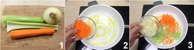 Para preparar o guisado de vitela com cogumelos, lave, descasque e pique finamente uma cebola, uma cenoura e um talo de aipo 1. Em uma panela grande e antiaderente, coloque 5 colheres de sopa de azeite de oliva extravirgem e refogue a cenoura 2, o aipo e a cebola 3.
