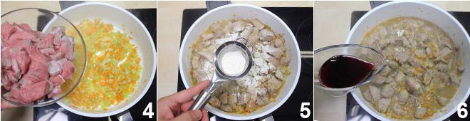 Adicione os cubos de carne e deixe dourar bem 4 junto ao refogado, depois adicione uma colher rasa de farinha, peneirando diretamente na panela e mexendo continuamente 5. Deixe cozinhar por alguns minutos e depois adicione o vinho tinto 6 e continue o cozimento por cerca de 40 minutos,