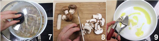 cobrindo a panela com uma tampa e deixando uma pequena abertura 7. Durante o cozimento, adicione, quando necessário, caldo de carne ou de legumes. Enquanto isso, limpe, descasque e corte os cogumelos champignon em fatias 8. Coloque em uma panela duas colheres de sopa de óleo e um (ou dois, dependendo do gosto) dente de alho esmagado 9.