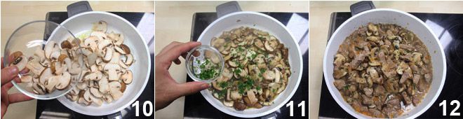 Em seguida, adicione os cogumelos 10 e deixe-os cozinhar em fogo alto por alguns minutos, adicionando a salsa picada finamente 11. Cinco minutos antes do final do cozimento da carne, adicione os cogumelos diretamente na panela do guisado, misture delicadamente e termine o cozimento, ajustando o sal e a pimenta 12. Sirva o guisado de vitela com cogumelos acompanhado de pão fresco, purê de batatas ou, no inverno, com polenta fumegante.