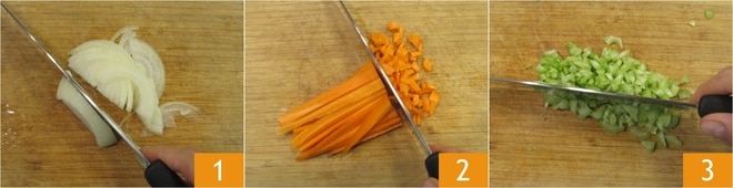 Para preparar o ensopado na panela de pressão, primeiro prepare os legumes para o refogado: descasque e fatie finamente a cebola 1, depois corte a cenoura 2 e o aipo 3 em cubos bem pequenos.