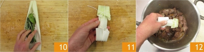 Enquanto isso, envolva os aromas dentro de uma folha de alho-poró 10 e sele-a com barbante de cozinha (se não tiver a folha de alho-poró, você pode amarrar simplesmente os aromas com o barbante, mantendo a sálvia e o louro do lado de fora e o alecrim do lado de dentro) 11. Adicione o maço aromático na panela 12.