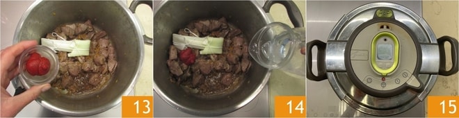 Adicione também o extrato de tomate 13 e a água 14, depois mexa. Feche com a tampa e leve à pressão 15. Quando ouvir o apito, abaixe o fogo e cozinhe por 15 minutos.