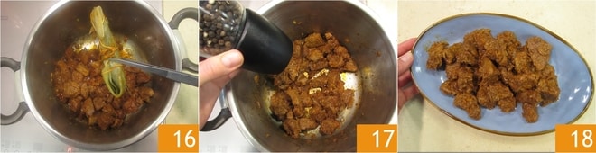 Após esse tempo, desligue o fogo e levante a válvula para liberar o vapor, depois abra a tampa. Remova o maço aromático 16 e ajuste o sal e a pimenta 17. O ensopado na panela de pressão está pronto para ser servido bem quente 18!