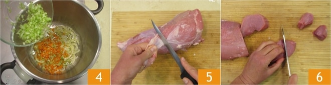 Despeje um fio de azeite na panela de pressão, adicione os legumes 4 e deixe cozinhar por 4-5 minutos. Enquanto isso, remova a gordura da carne 5 e corte-a em pedaços 6.