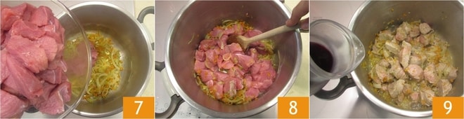 Adicione os pedaços de carne ao refogado 7 e doure por alguns minutos em fogo médio-alto, mexendo para selá-los de todos os lados 8. Neste ponto, regue com o vinho tinto 9 e deixe evaporar completamente.