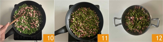Termine o cozimento 10 e desligue o fogo 11. As ervilhas estão prontas para serem servidas, basta levá-las à mesa 12.