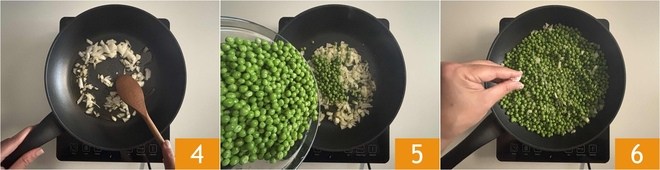 Quando a cebola estiver macia 4, acrescente as ervilhas 5 e ajuste o sal 6.