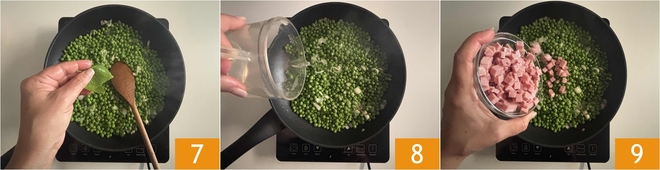 Perfume com manjericão fresco 7, despeje cerca de 50 g de água 8 e reserve o restante: adicione apenas se necessário. Cozinhe as ervilhas em fogo baixo, mexendo de vez em quando por cerca de 10-15 minutos. Quando faltarem cerca de 5 minutos, adicione o presunto cozido previamente cortado em cubos 9.