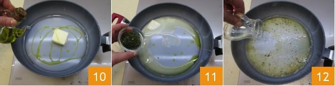 Em seguida, pegue outra frigideira antiaderente. Derreta a manteiga em fogo baixo com um fio de óleo 10. Quando a manteiga estiver derretida, adicione a mistura de alecrim e sálvia 11. Adicione o vinho branco neste ponto para refrescar 12.
