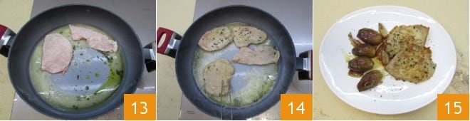 Coloque então os seus escalopes para cozinhar na frigideira 13. Vire os escalopes de tempos em tempos para permitir um cozimento uniforme 14. Deixe cozinhar por 2-3 minutos para que dourem bem. Então, sirva acompanhado das chalotas caramelizadas. Os seus escalopes ao alecrim e sálvia com chalotas caramelizadas estão prontos para serem servidos e saboreados quentes 15!