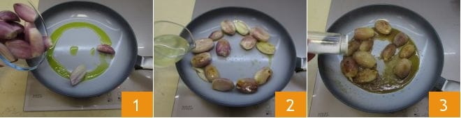 Para preparar os escalopes ao alecrim e sálvia com chalotas caramelizadas, comece preparando um Caldo de legumes. Enquanto prepara o caldo de legumes, pegue as chalotas. Retire a casca externa e corte-as ao meio. Agora, pegue uma frigideira antiaderente e despeje um fio de óleo. Adicione as chalotas cortadas ao meio 1 e vire-as para dourar uniformemente. Refresque com o caldo de legumes 2 e ajuste o sal 3 e a pimenta. Tampe a frigideira com uma tampa e deixe cozinhar por 10 minutos em fogo alto, dependendo da espessura da chalota. Espete a chalota com um garfo para verificar se estão cozidas.