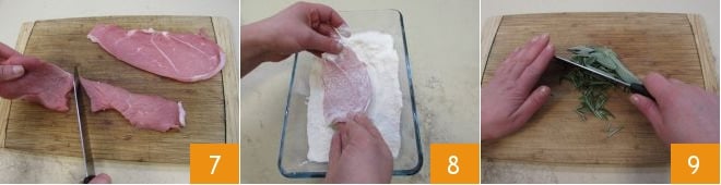 Agora, proceda com a preparação dos escalopes. Coloque os escalopes em uma tábua de corte e corte-os em pequenas fatias 7. Em seguida, coloque a farinha de trigo em um recipiente grande e enfarinhe as fatias de carne, passando-as de todos os lados 8. É importante que as fatias estejam totalmente cobertas de farinha. Reserve as fatias enfarinhadas em um prato. Depois, pegue a sálvia e o alecrim. Retire as folhas da parte lenhosa do alecrim. Pique finamente a sálvia e o alecrim juntos 9. Reserve a mistura de ervas em uma tigelinha.