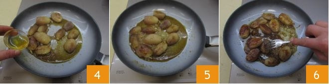 Após a evaporação do caldo de legumes, adicione o mel 4 e deixe cozinhar por mais 2-3 minutos 5, continuando a virar as chalotas 6 para permitir um cozimento uniforme e que o mel se misture completamente com as chalotas. As chalotas estarão prontas.
