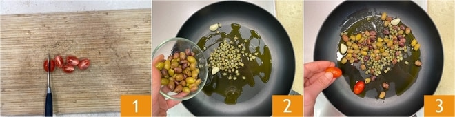 Para preparar os escalopes de frango saborosos, a primeira coisa a fazer é lavar os tomatinhos e cortá-los ao meio 1. Em uma frigideira grande, coloque um fio de azeite, 2 dentes de alho, as alcaparras e as azeitonas 2. Acenda o fogo e posicione os tomatinhos um a um com a parte cortada em contato com a frigideira 3.