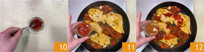 Enquanto isso, dissolva o extrato de tomate em pouca água 10. Adicione-o à frigideira 11 e acrescente a água restante para limpar bem a tigela 12.