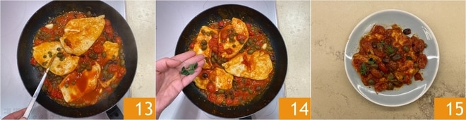 Misture bem 13 e cozinhe por mais alguns minutos. Neste ponto, adicione as folhinhas de orégano fresco 14, apenas uma pitada de sal, pimenta e sirva seus escalopes bem quentes 15.
