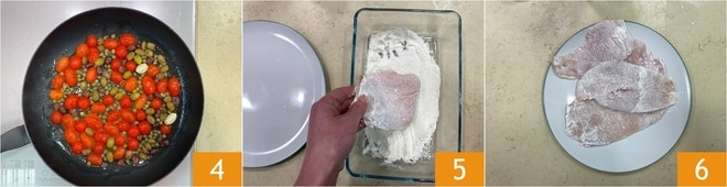 Deixe cozinhar em fogo médio-alto por cerca de 5 minutos 4. Enquanto isso, verifique se as fatias de frango estão finas, caso contrário, bata-as com um martelo de carne. Enfarinhe as fatias de peito de frango de todos os lados 5, sacuda o excesso e vá colocando-as em um prato 6.