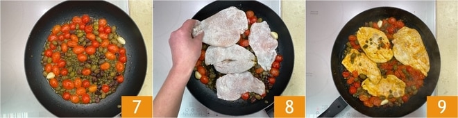 Quando os tomatinhos estiverem bem dourados 7, coloque as fatias de peito de frango na frigideira 8. Doure por alguns minutos, depois vire as fatias usando uma pinça e doure também do outro lado 9.