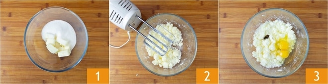 Para preparar a farofa de ricota e geleia, primeiro deixe a ricota escorrer em uma peneira fina por 30 minutos. Enquanto isso, dedique-se à preparação da base. Em uma tigela, coloque o açúcar, adicione a manteiga 1 e bata com um mixer por alguns minutos até obter uma mistura farinácea 2. Em seguida, adicione os ovos e o extrato de baunilha 3.