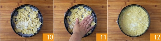 Forre com papel manteiga uma forma de fundo removível de 22 cm de diâmetro, distribua dentro metade da massa 10 e compacte com as mãos 11 até cobrir completamente a base da forma 12.