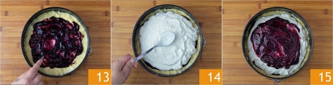 Cubra a base com metade da geleia, deixando uma borda de cerca de 1 cm livre 13, depois adicione também o creme de ricota 14. Por fim, adicione delicadamente o restante da geleia sobre o creme 15.