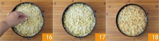 Cubra tudo com a massa restante 16 chegando até a borda externa 17. Asse em forno estático a 180° por 45 minutos, até que a farofa esteja bem dourada 18. Deixe esfriar completamente e desenforme. A farofa de ricota e geleia está pronta para ser saboreada!