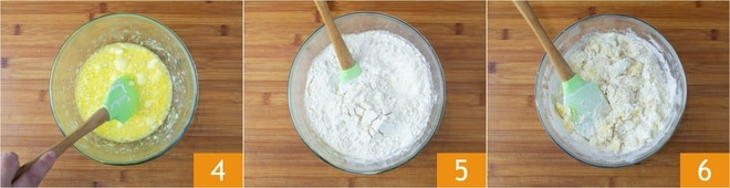 Misture a massa com a espátula 4, depois adicione a farinha de trigo e o fermento, previamente peneirados 5. Misture inicialmente com uma espátula 6.