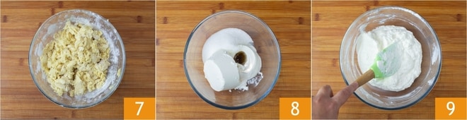 Continue então com as mãos até obter grandes migalhas e reserve 7. Passe para o recheio: em uma tigela, coloque o açúcar, a ricota e o extrato de baunilha 8, depois misture com a espátula, o resultado deve ser um creme homogêneo 9.