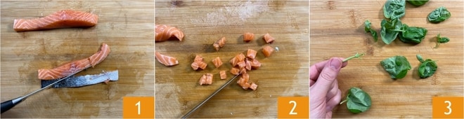 Para preparar os espaguetes com salmão e stracciatella ao manjericão, comece pelo salmão. Remova a pele 1 e corte-o em cubos de 2 cm 2. Pegue agora as folhas de manjericão e separe-as dos talos 3. Coloque no fogo uma panela que servirá para o cozimento da massa.